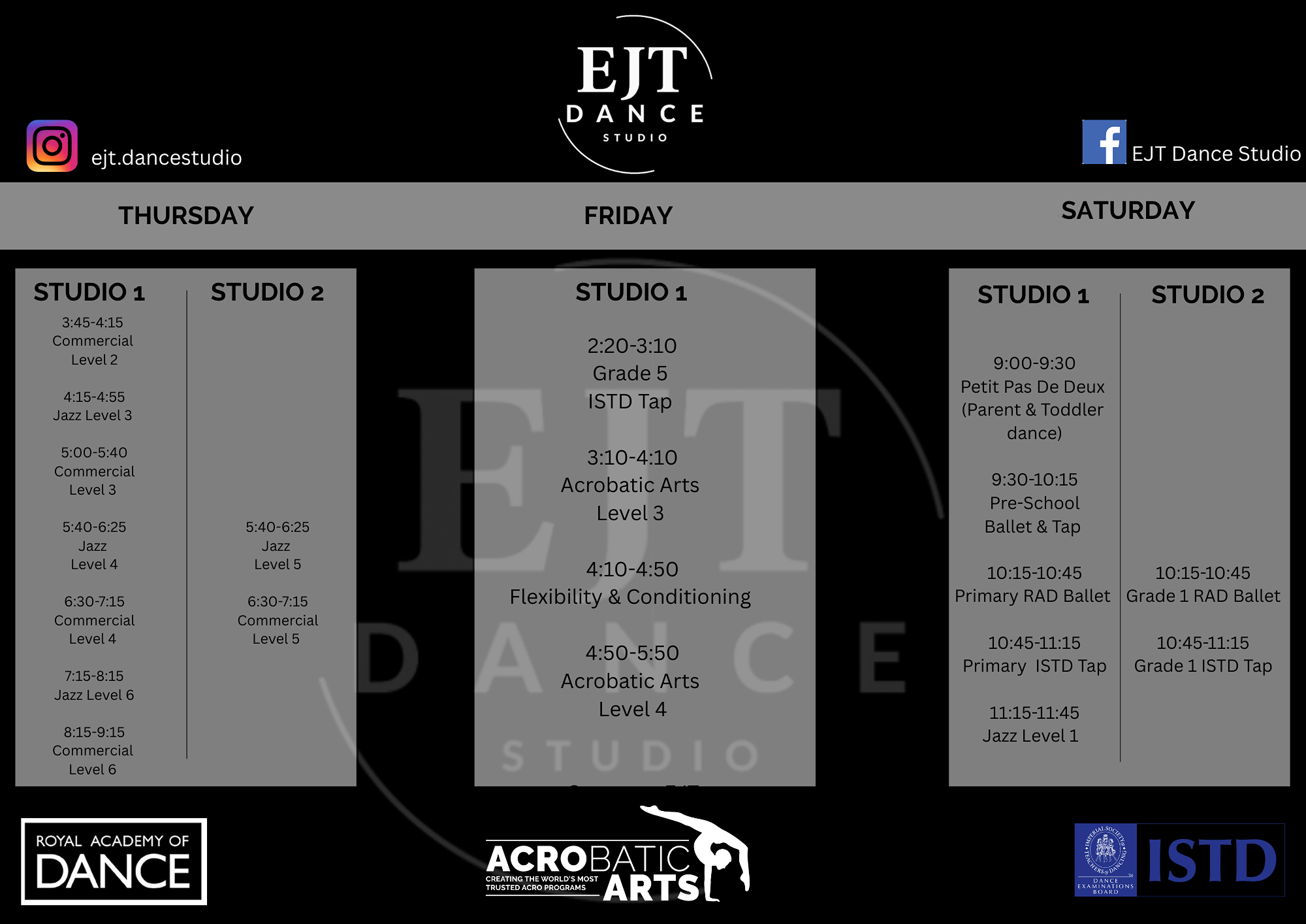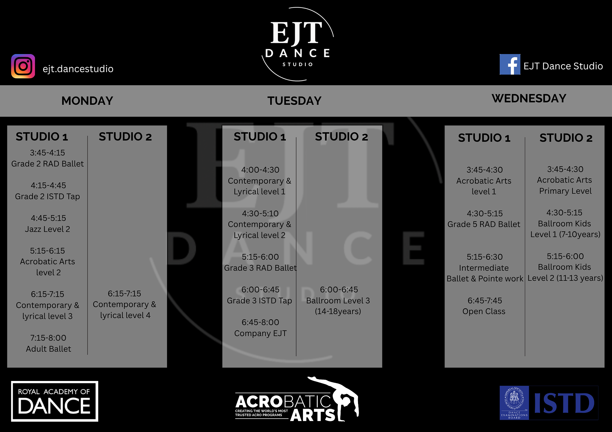 At EJT, we believe in placing dancers according to their individual ability and developmental stage rather than age alone. Following the structured progression of RAD, ISTD, Acrobatic Arts syllabi, our classes are carefully designed to support safe dance practice and training.